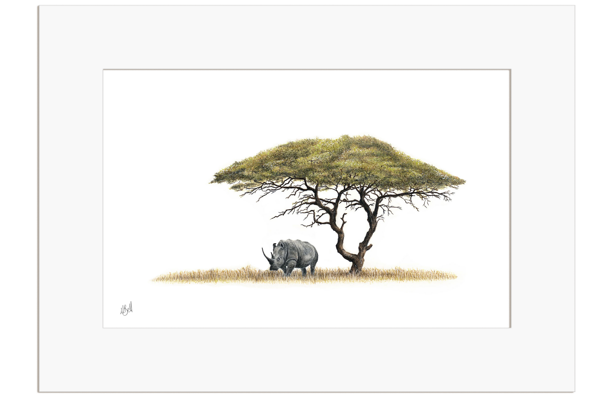 Acacia Tree and White Rhino drawing by Matthew Bell